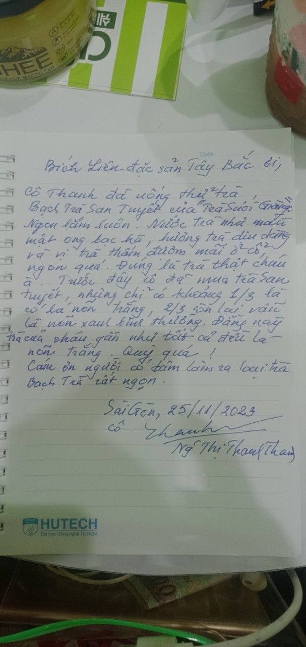 Cô Thanh đã uống thử trà, Bạch Trà San Tuyết của Trà Suối Giàng. Ngon lắm luôn, nước trà như nước mật ong bạc hà, hương trà dịu dàng và vị trà thấm đượm mãi ở cổ, ngoan quá. Đúng là trà thật cháu à! Trước đây cô đã mua trà San Tuyết, nhưng chỉ có khoảng 1/3 là có lá nõn trắng, 2/3 còn lại vẫn là nõn xanh bình thường. Đằng này trà của cháu gần như tất cả đều là lá nõn trắng. Quý quá!